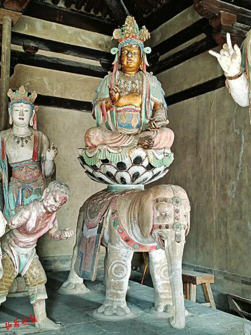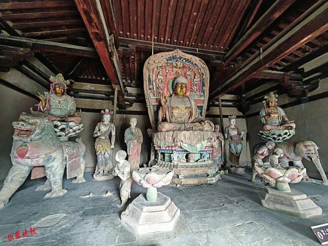 大殿和殿内的唐代彩塑,是南禅寺的镇寺之宝。大殿是我国现存最古老的唐代木结构建筑,殿内现存14尊唐代彩塑,包含释迦牟尼佛、文殊菩萨、普贤菩萨及护法天王等。泥塑丰润流畅,与敦煌莫高窟唐代塑像一脉相承。其中,最引人注目的是普贤菩萨和文殊菩萨前后塑立的四尊胁侍菩萨,呈优美自然的“S”形站姿,有别于唐之前塑像并腿直立的状态。文殊菩萨形象尤为特殊:原本应与普贤菩萨一样身着天衣,半身,但现存造像身披螺旋状甲胄,体现了唐代密宗发展赋予文殊菩萨“护国破敌”的特殊寓意。此外,塑像立于近半米高的佛坛之上,佛坛呈倒“凹”字形,占据殿内近半空间,反映了唐代绕坛礼佛的宗教仪轨,与明清时期跪拜礼佛所需的前置空间形成鲜明对比。