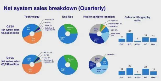 从ASML公布的二季度财报数据来看,整体表现并非毫无亮点。营收同比增长23.2%至76.9亿欧元,高于市场预期;净利润为23亿欧元,同比增长45%;毛利率达到53.7%,新增订单55亿欧元,这些指标都展现出了公司在光刻机市场的强大竞争力与盈利能力。然而,当我们将目光聚焦到地区分布时,问题便浮出水面。