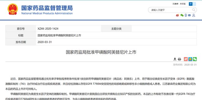 阿美替尼(Ameile,阿美乐)是由翰森制药研发,是我国自主研发并拥有自主知识产权的创新药。2020年3月获得药监局批准用于既往经表皮生长因子受体(EGFR)酪氨酸激酶抑制剂(TKI)治疗时或治疗后出现疾病进展,并且经检测确认存在EGFR T790M突变阳性的局部晚期或转移性非小细胞肺癌成人患者。