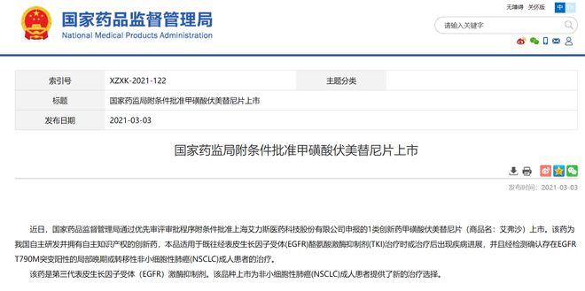 阿斯利康研发的奥希替尼是第三代表皮生长因子受体(EGFR)酪氨酸激酶抑制剂(TKI)。于2015年11月获得美国FDA加速批准用于经EGFR-TKI治疗后出现T790M耐药突变的转移性NSCLC,2017年进入中国市场。可用于具有表皮生长因子受体(EGFR)外显子19缺失或外显子21(L858R)置换突变的局部晚期或转移性非小细胞肺癌(NSCLC)成人患者的一线治疗以及既往经表皮生长因子受体(EGFR)酪氨酸激酶抑制剂(TKI)治疗时或治疗后出现疾病进展,并且经检测确认存在EGFRT790M突变阳性的局部晚期或转移性非小细胞性肺癌(NSCLC)成人患者的治疗。