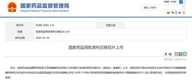 利厄替尼(Limertinib,奥壹新)是江苏奥赛康药业新开发的第三代表皮生长因子受体(EGFR)酪氨酸激酶抑制剂(TKI),2025年1月16日获得国家药品监督管理局批准,用于既往经表皮生长因子受体(EGFR)酪氨酸激酶抑制剂(TKI)治疗时或治疗后出现疾病进展,并且经检测确认存在EGFR T790M突变阳性的局部晚期或转移性非小细胞肺癌(NSCLC)成人患者的治疗。
