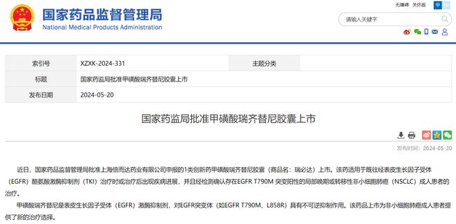瑞齐替尼(瑞必达®)是倍而达药业自主研发的一款不可逆、高选择性的第三代小分子表皮生长因子受体酪氨酸激酶抑制剂(EGFR-TKI)。2024年5月获得国家药监局,目前获批的适应症为具有EGFR外显子19缺失或外显子21(L858R)置换突变的局部晚期或转移性非小细胞肺癌(NSCLC)成人患者的一线治疗、既往经EGFR-TKI治疗出现疾病进展,并且伴随EGFR T790M突变阳性的局部晚期或转移性NSCLC成人患者的治疗。
