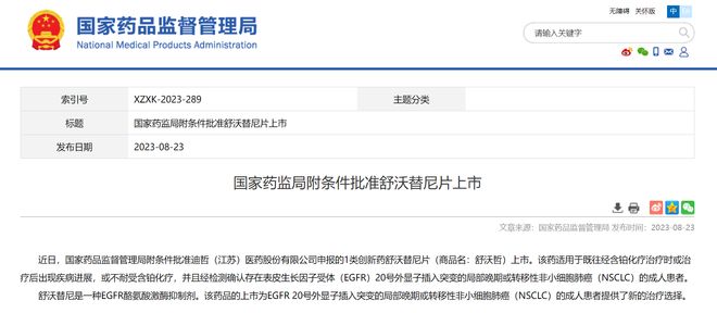 舒沃替尼(Sunvozertinib,舒沃哲)是迪哲医药研发的一种EGFR酪氨酸激酶抑制剂。2023年8月获得国家药监局批准,用于既往经含铂化疗治疗时或治疗后出现疾病进展,或不耐受含铂化疗,并且经检测确认存在表皮生长因子受体(EGFR)20号外显子插入突变的局部晚期或转移性非小细胞肺癌(NSCLC)的成人患者。