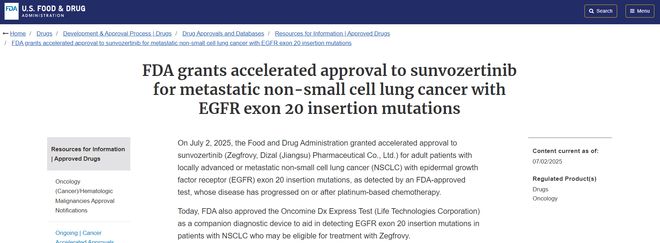 2025年7月获得美国FDA批准用于既往经含铂化疗治疗时或治疗后出现疾病进展,存在表皮生长因子受体(EGFR)20号外显子插入突变(exon20ins)的局部晚期或转移性非小细胞肺癌(NSCLC)的成人患者。