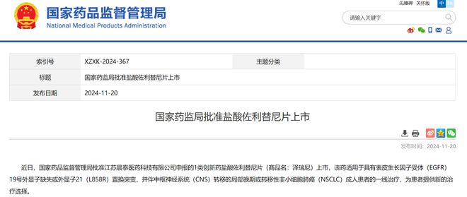 佐利替尼(zorifertinib,泽瑞尼)是晨泰医药与阿斯利康合作开发的EGFR抑制剂,于2024年11月20日在国内获批,用于具有表皮生长因子受体(EGFR)19号外显子缺失或外显子21(L858R)置换突变,并伴中枢神经系统(CNS)转移的局部晚期或转移性非小细胞肺癌(NSCLC)成人患者的一线治疗。