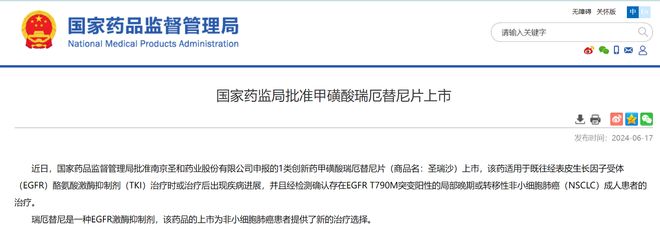 瑞厄替尼(圣瑞沙®)由南京圣和药业研发的EGFR激酶抑制剂。2024年6月获得国家药监局批准,适用于既往经表皮生长因子受体(EGFR)酪氨酸激酶抑制剂(TKI)治疗时或治疗后出现疾病进展,并且经检测确认存在EGFR T790M突变阳性的局部晚期或转移性非小细胞肺癌(NSCLC)成人患者的治疗。