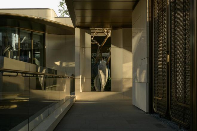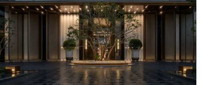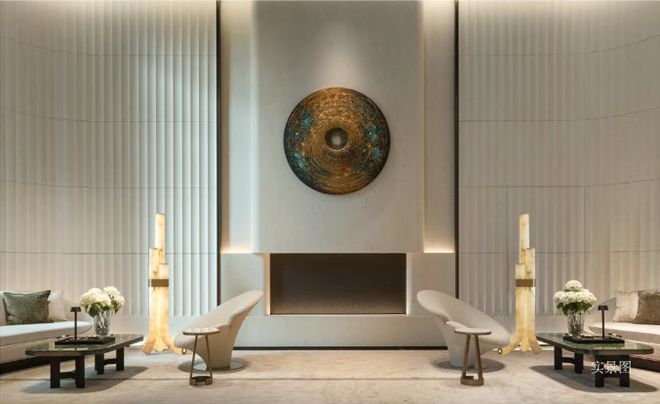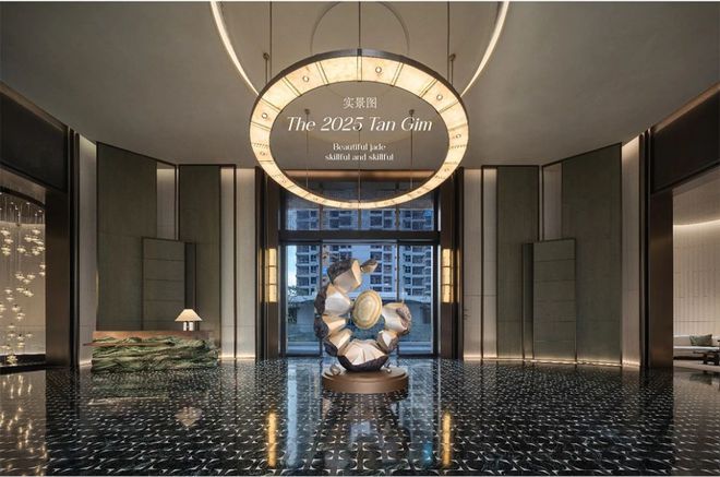 皇家白玉的仪式感:归家环岛前庭中央,整石切割的皇家白玉发光圆盘,形似平安扣,寓意“财运亨通”;7米高黄铜大门左右矗立四幅皇家白玉玉璧,晨光漫溢时,温润玉泽如神鹿衔星坠入凡尘。