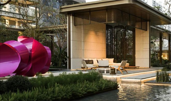 移步社区精心设计的“玉榭”庭院会客场景,精雕定制方胜纹格栅若隐若现,与《玉夏花漾》艺术作品共同营造花林水院间的隐奢意境。