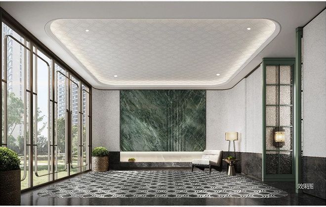 步入楼栋礼序前庭,方胜纹拼花地面如展开的琳琅画卷,精工打造的每道棱线皆诉说着世家的仪式尊荣。立面点缀长条发光白玉石以及天珺特色奢石猫眼绿,于端庄格局中透射温润辉光。方胜图腾在此升华为门庭的家族徽章,以大地为宣纸,镌刻归家的首重礼赞。